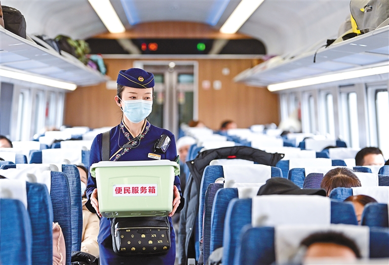 1月30日,中國鐵路青藏集團(tuán)有限公司西寧客運(yùn)段動(dòng)車隊(duì)乘務(wù)員王璐在為旅客服務(wù)。新華社記者 張龍 攝