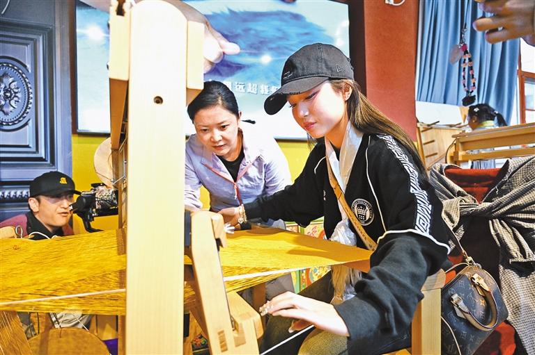 在江孜縣“阿佳格桑工坊”,工坊負(fù)責(zé)人阿佳格桑和江孜縣群團(tuán)工作部黨組書記、部長央吉向剛到的日本游客獻(xiàn)上潔白的哈達(dá),歡迎遠(yuǎn)道而來的客人。走進(jìn)工坊,游客們被精美的藏族氆氌技藝震撼,看著藏族婦女正在編織,便躍躍欲試。在央吉的帶領(lǐng)下,日本游客紛紛踏上編織機(jī),有模有樣地學(xué)起了編織,豎起拇指稱贊不斷。