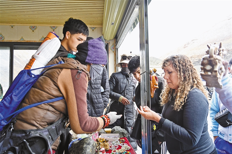 新奇感過后,游客們開啟購物模式?!鞍⒓眩@個掛飾可以定制嗎?”“你們可以發(fā)快遞嗎?”對于一連串的問題,阿佳格桑忙碌地一一回答著,“你們想要什么圖形,我們就給你定制什么圖形。”“我們這兒快遞很快,今天下單明天就給你發(fā)!”短短半個小時,“阿佳格桑工坊”的生意火爆,銷售藏式靠墊、藏式地毯、掛飾等特色產(chǎn)品4000多元?!盎厝ズ螅乙ㄟ^自媒體平臺,宣傳這次西藏之旅的所見所聞,讓更多親朋好友來西藏旅游!”日本游客琴音有感而發(fā)。