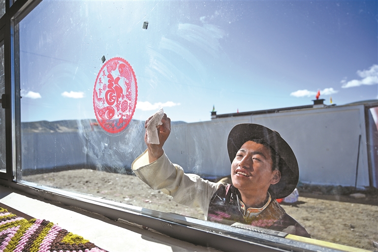 薩迦縣雄麥鄉(xiāng)扎果村群眾擦拭新家窗戶。本網(wǎng)記者 扎西頓珠 攝