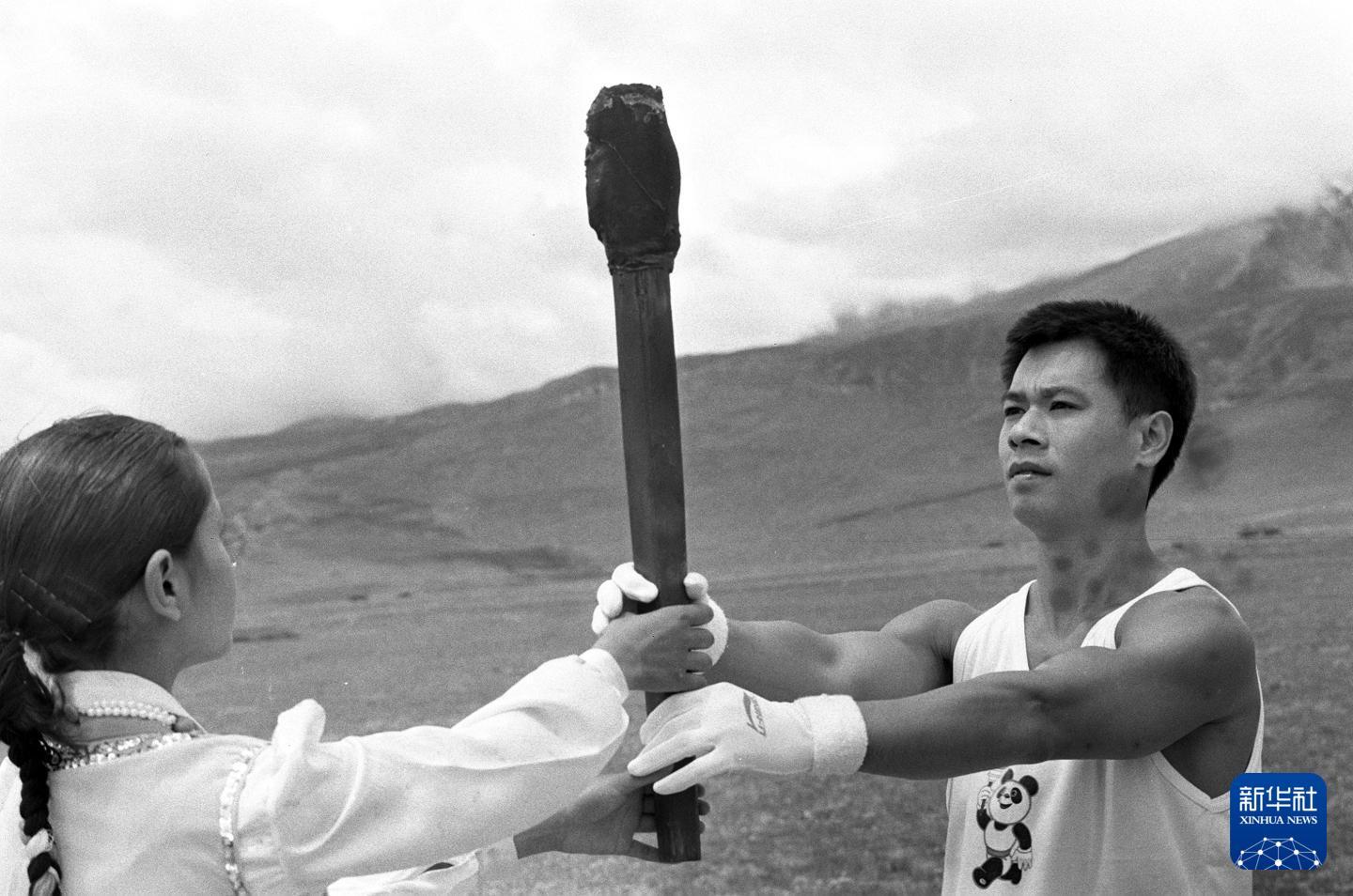 1990年8月7日,第十一屆亞運圣火火種在西藏取得。這是負(fù)責(zé)采集火種的15歲的藏族姑娘達(dá)瓦央宗(左)將火種交給運動員李寧。
