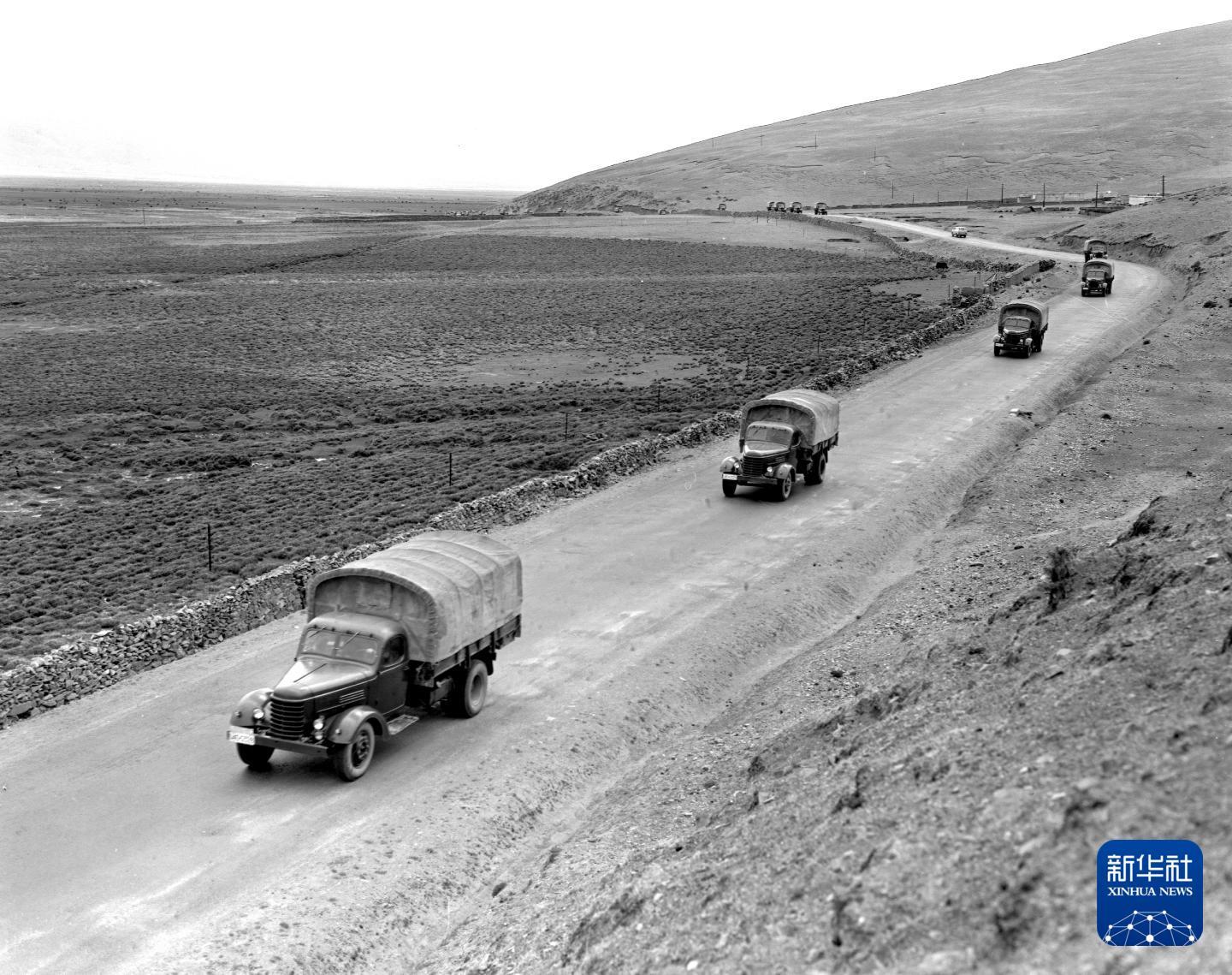 國家重點建設(shè)項目青藏公路改建工程,經(jīng)過筑路軍民12年的艱苦奮戰(zhàn)后全部竣工。這是滿載物資的汽車行駛在青藏公路上。(1985年8月13日發(fā))