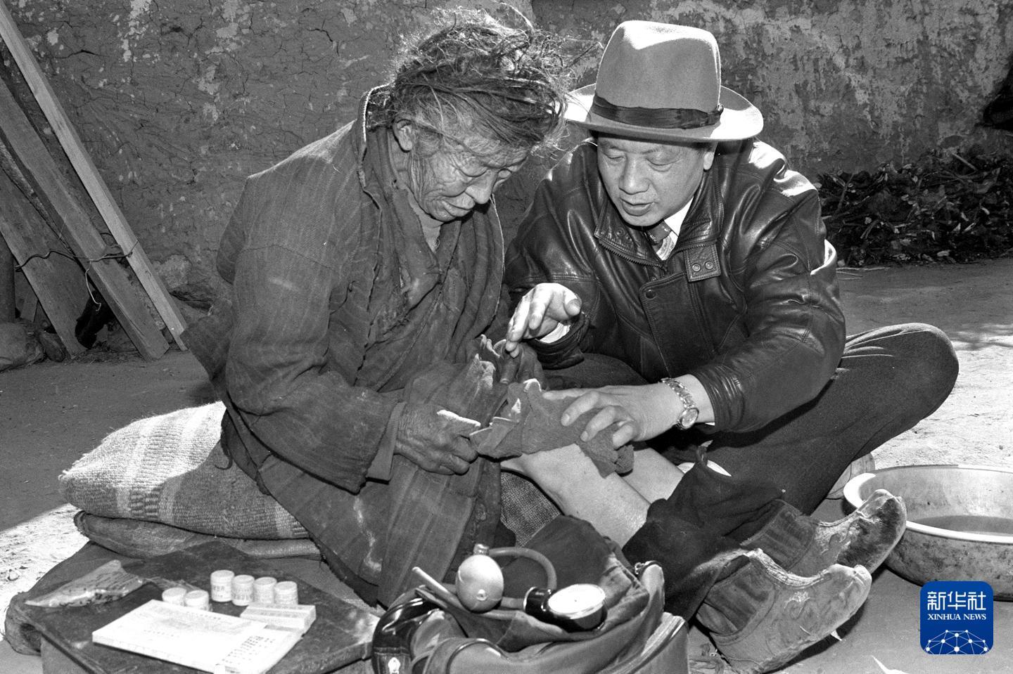 孔繁森在阿里日土縣過巴鄉(xiāng)為孤寡老人益西卓瑪(左)治病。