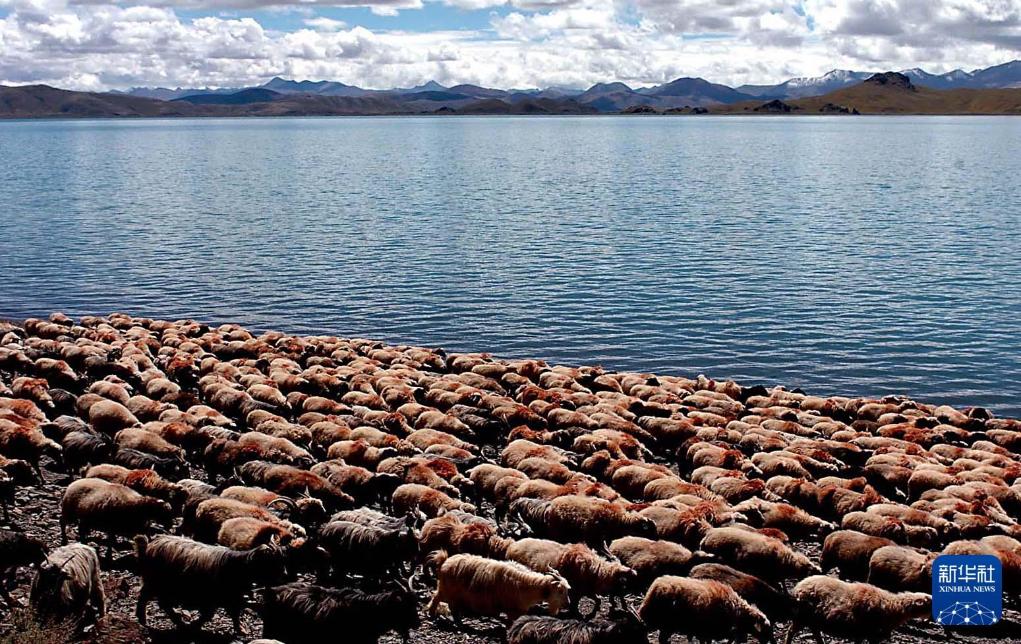 羊卓雍錯邊的羊群。羊卓雍錯藏語意為“碧玉湖”。當(dāng)?shù)匕傩樟鱾髦@樣一首民歌:“天上的仙境,人間的羊卓;天上的繁星,湖畔的羊群?!保?004年9月19日攝)