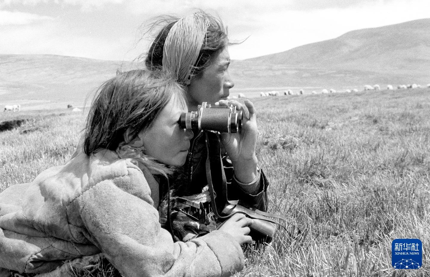西藏自治區(qū)班戈縣牧民次仁頓球(右)和熱巴倆弟兄用望遠(yuǎn)鏡觀察畜群。(1987年10月7日發(fā))