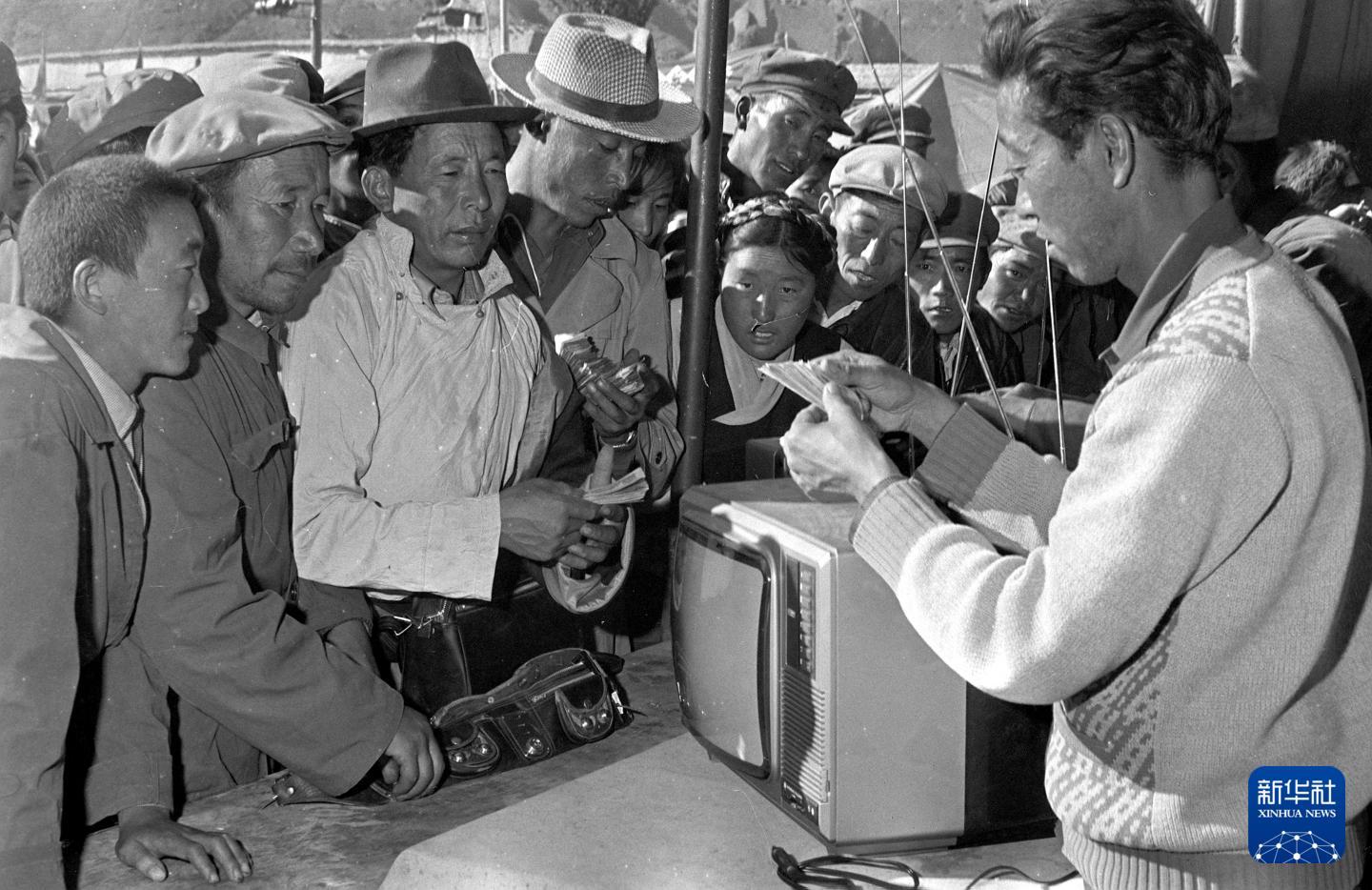 西藏聶拉木縣宗堆公社社員阿旺(左三)開茶館做生意,收入了4萬多元。圖為他在日喀則貿(mào)易公司購買了一部彩色電視機(jī)。(1984年11月17日發(fā))