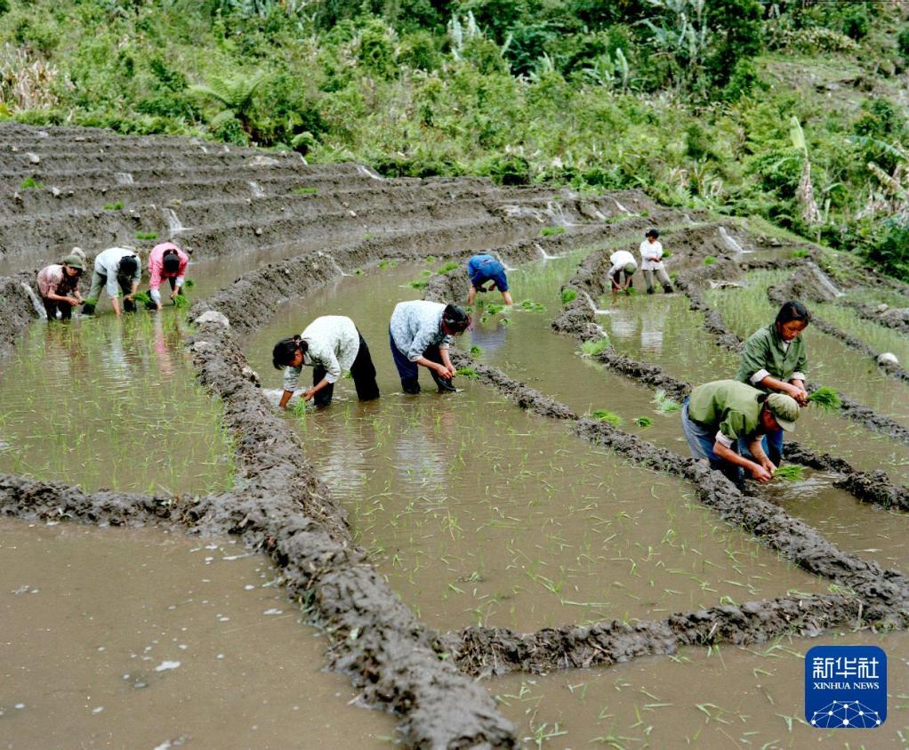 墨脫縣門巴族社員在稻田里插秧。當(dāng)時的門巴族人民修了梯田,常年耕作,增加土地肥力,使糧食產(chǎn)量逐年上升。(1983年11月22日發(fā))