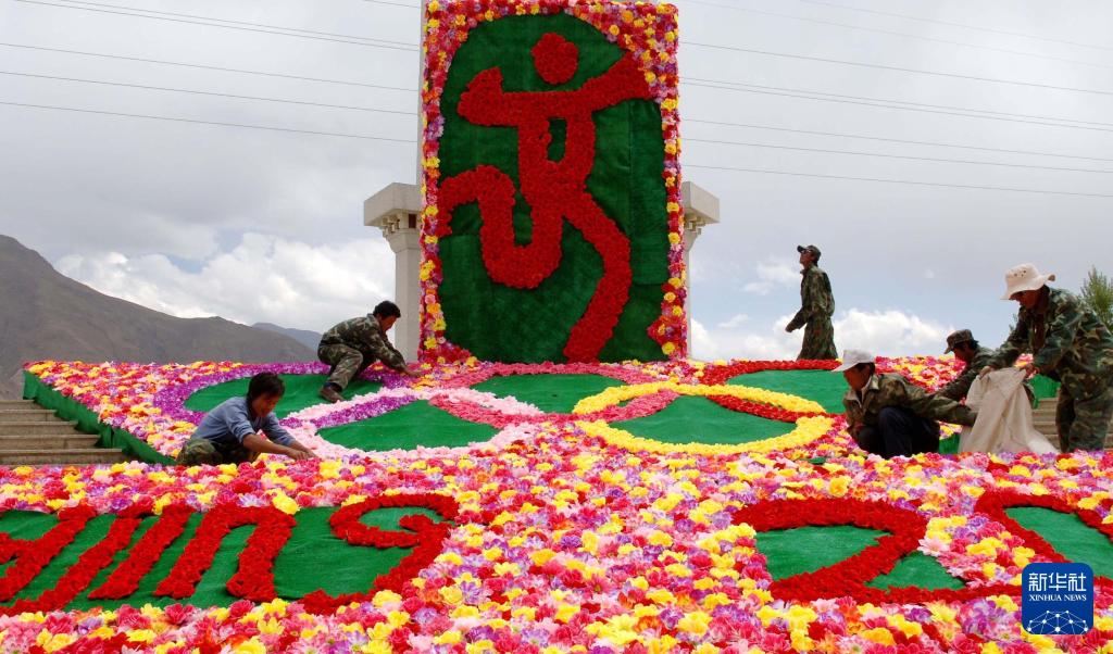 2008年4月29日,拉薩市園林工人在布置花卉景觀。當(dāng)時,拉薩市區(qū)的主要街道擺放了花卉和奧運標(biāo)志,迎接北京奧運會倒計時100天。