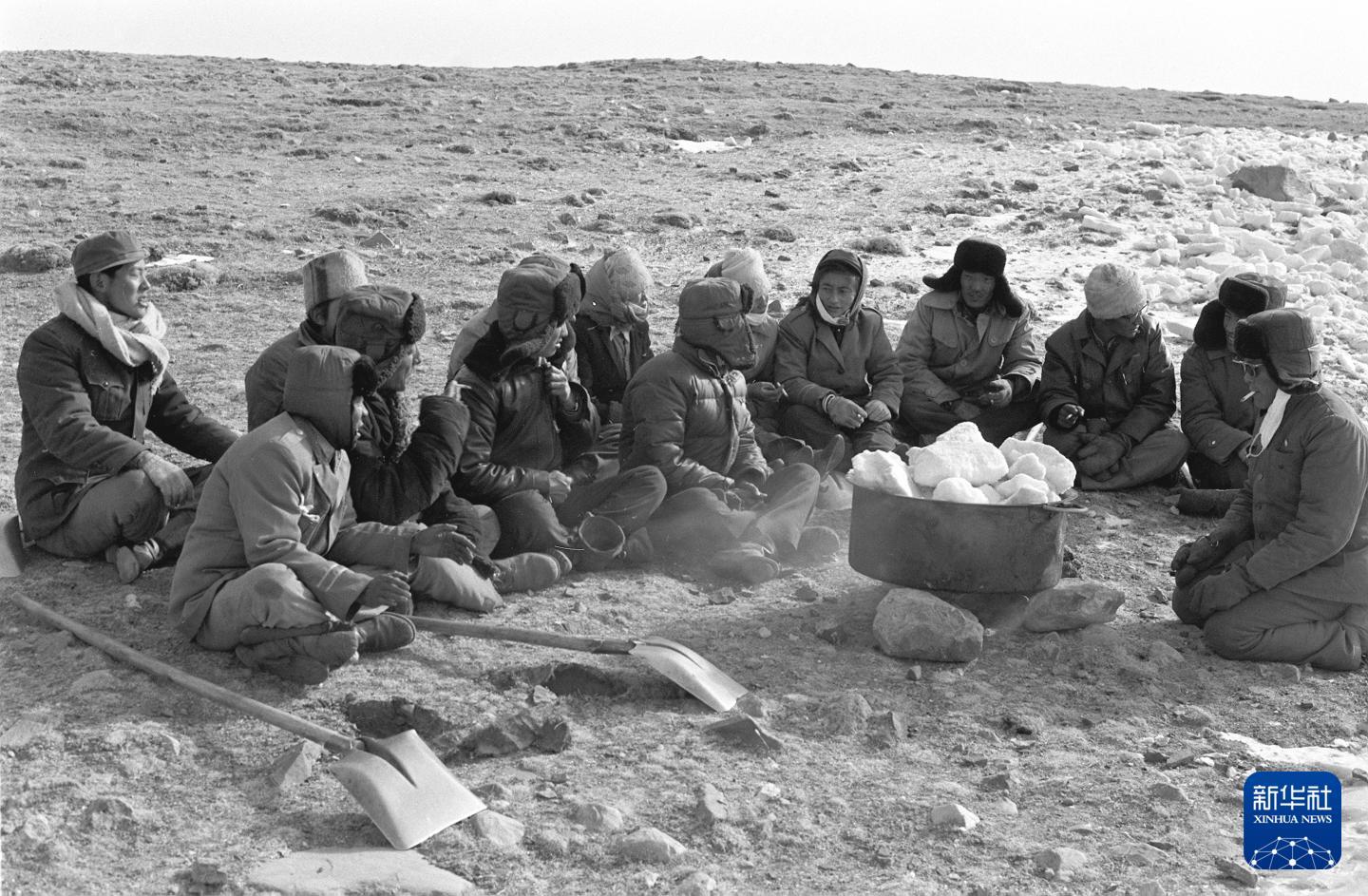 唐古拉山上常年居住著10多名藏族養(yǎng)路工,他們擔(dān)負(fù)著維修和保養(yǎng)公路的任務(wù)。這是工人們在工地上化冰燒水,準(zhǔn)備午餐。(1989年4月29日發(fā))