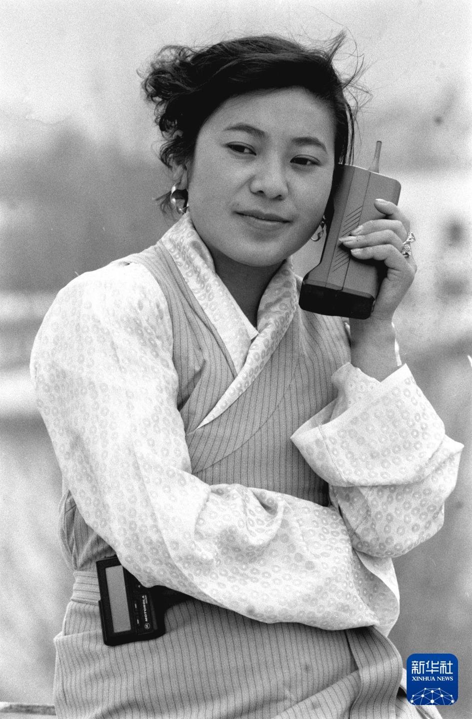 腰掛BP機(jī)、手持“大哥大”的藏族女商人拉珍正和四川的客戶洽談生意。(1994年5月31日發(fā))