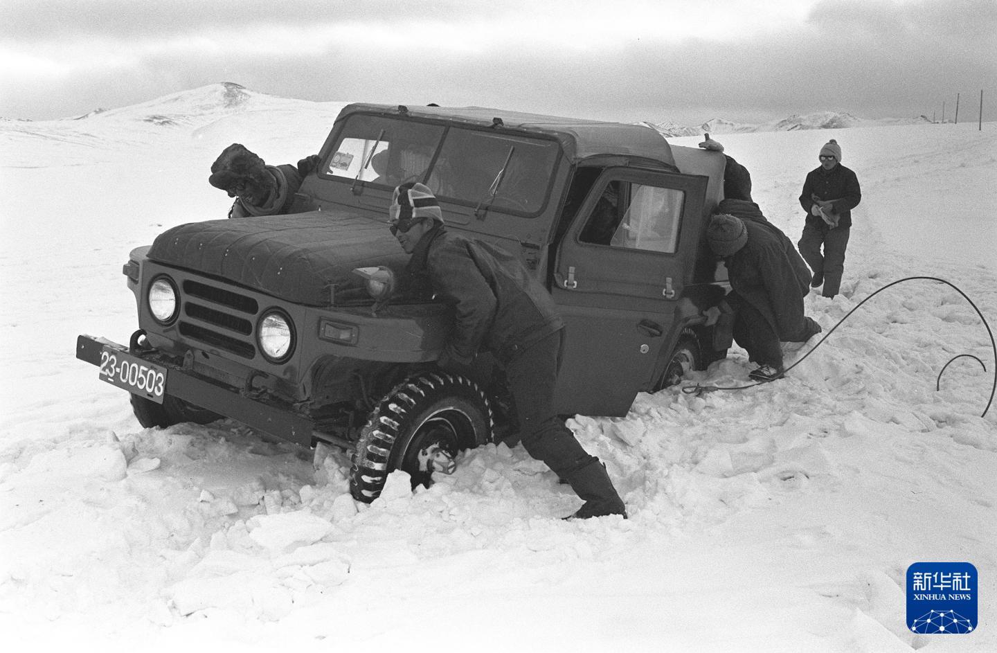 1989年,青藏公路沿線,一輛汽車陷入積雪。這是道班工人協(xié)力抬車脫困。(1989年4月29日發(fā))