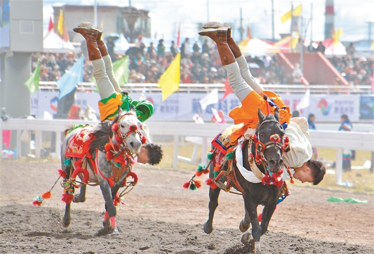 來(lái)自四川、青海及西藏本地的馬術(shù)隊(duì)英姿颯爽,躍馬揚(yáng)鞭;千人共舞《禮贊甲子》,舞步豪邁,衣袂飛揚(yáng),再現(xiàn)西藏六十年的滄桑巨變;器樂(lè)合奏《風(fēng)從浙江來(lái)·樂(lè)在那曲揚(yáng)》則巧妙融合江南韻律與草原風(fēng)情,奏響對(duì)口支援的深情厚誼;《馱鹽之歌》悠揚(yáng)響起,仿佛將人們帶回了古老的歲月,展現(xiàn)了高原兒女堅(jiān)韌不拔的精神……賽馬場(chǎng)核心區(qū)域,傳統(tǒng)馬術(shù)與現(xiàn)代藝術(shù)在這里交相輝映,引來(lái)掌聲如潮、喝彩不絕。