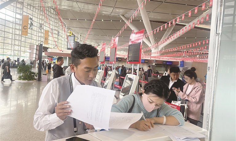 9月14日,萬女士按時抵達(dá)拉薩貢嘎國際機場祥鵬航空值機柜臺。地面服務(wù)工作人員認(rèn)真查看了《動物檢疫合格證明》、寵物疫苗注射證明等材料,迅速為萬女士辦理了相關(guān)乘機手續(xù)。隨后,工作人員全程提供陪同服務(wù),先與機場安檢部門積極協(xié)調(diào),幫助萬女士和寵物高效通過安檢;接著引領(lǐng)萬女士登機,并與航班客艙經(jīng)理做好詳細(xì)交接。