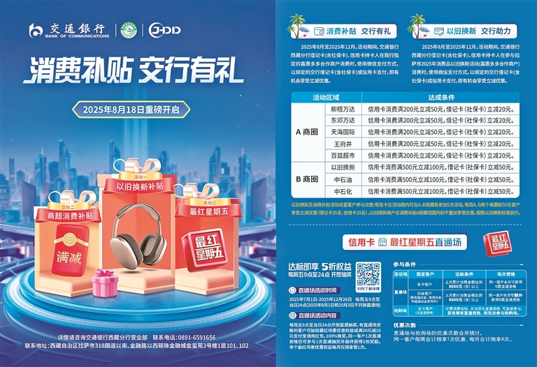 在助力文旅消費(fèi)提振的大背景下,交行西藏分行同步推出拉薩交行消費(fèi)補(bǔ)貼活動(dòng),為拉薩當(dāng)?shù)鼐用駧砹藢?shí)實(shí)在在的優(yōu)惠。8月至12月,市民朋友使用交通銀行西藏分行借記卡(含社??ǎ⑿庞每ㄔ诶_柳梧萬達(dá)、東郊萬達(dá)、天海國際、王府井等商超消費(fèi)或參與以舊換新、加油活動(dòng),均可享受立減優(yōu)惠。在2025拉薩半程馬拉松活動(dòng)現(xiàn)場(chǎng),交行設(shè)置了線下金融服務(wù)點(diǎn)位,為來往的市民以及參賽選手提供優(yōu)質(zhì)的金融服務(wù),讓民眾在享受賽事激情的同時(shí),也能感受到交行帶來的生活便利與品質(zhì)提升。