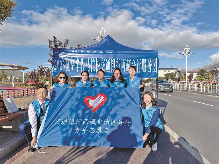 交通銀行西藏分行青年志愿者在補(bǔ)給站開展賽事服務(wù)工作合影。
