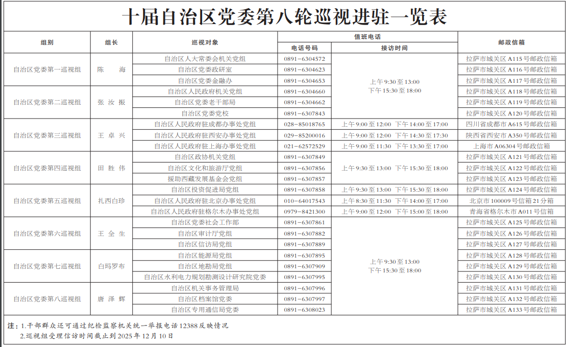 本網(wǎng)拉薩10月25日訊(記者 趙文慧 見習記者 土旦仁青)根據(jù)自治區(qū)黨委關于巡視工作的統(tǒng)一部署,截至10月24日,十屆自治區(qū)黨委第八輪巡視完成進駐工作。自治區(qū)黨委巡視組將對自治區(qū)人大常委會機關、政府機關、政協(xié)機關,自治區(qū)黨委社會工作部、政研室、金融辦、老干部局、機關事務管理局、黨校,自治區(qū)審計廳、信訪局、能源局、投資促進局、地勘局、檔案館、專用通信局、水利電力規(guī)劃勘測設計研究院,自治區(qū)人民政府駐北京辦事處、駐成都辦事處、駐西安辦事處、駐上海辦事處、駐格爾木辦事處,援助西藏發(fā)展基金會等23個區(qū)直單位黨組織開展常規(guī)巡視;對自治區(qū)文化和旅游廳黨組開展巡視“回頭看”。