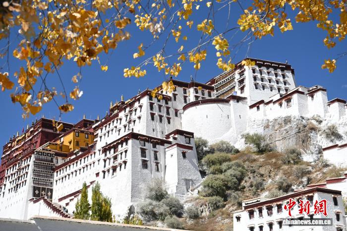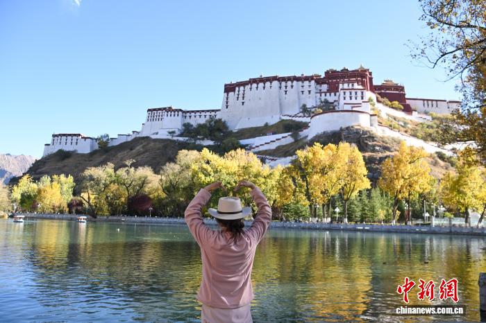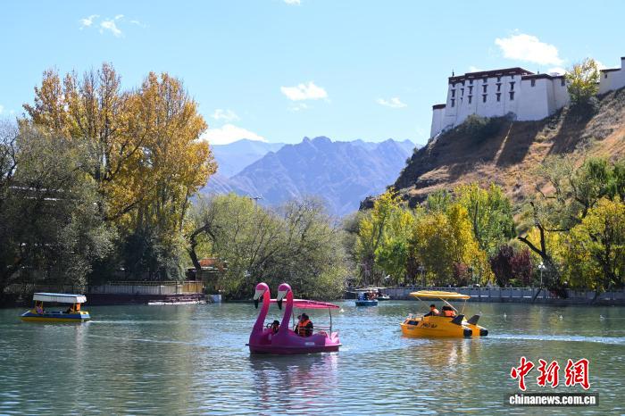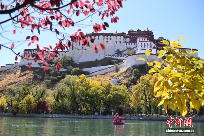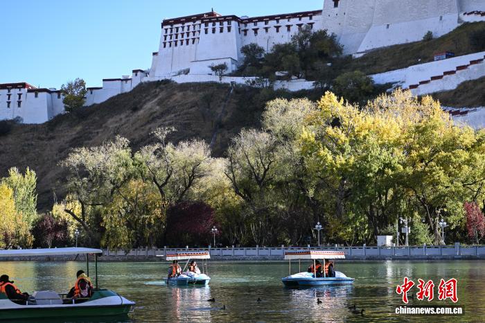 10月25日,金秋時(shí)節(jié),西藏拉薩市宗角祿康公園進(jìn)入最佳觀(guān)賞期。人工湖畔楊樹(shù)、柳樹(shù)褪去翠綠,換上金黃與橙紅的盛裝,倒映在澄澈湖水中,與布達(dá)拉宮的紅墻白宮相映成趣。中新社記者 貢嘎來(lái)松 攝