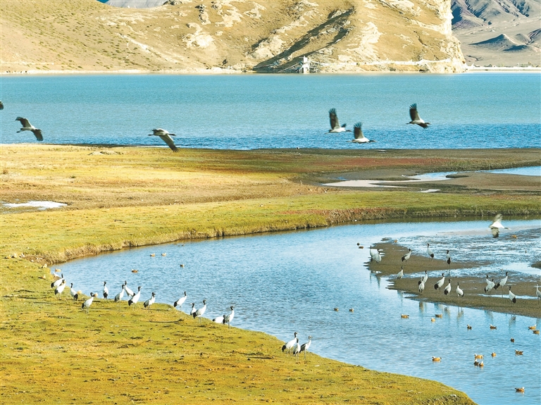 秋日的林周,是冬日驚喜的溫柔鋪墊。往雅魯藏布江黑頸鶴國家自然保護(hù)區(qū)走去,遠(yuǎn)處念青唐古拉山覆著薄雪,近處水面倒映秋樹,幾道亮麗的身影忽然從蘆葦叢中探出——正是早早遷來的黑頸鶴。護(hù)林員頓珠次仁壓低聲音說:“今年它們來得比往年早幾天,現(xiàn)在有30多只,但11月中下旬到次年3月,2000多只黑頸鶴會(huì)陸續(xù)飛來,卡孜鄉(xiāng)的青稞地、江熱夏鄉(xiāng)的濕地里,到處都有它們踱步、展翅的身影,那才是林周冬天珍貴的景象。”游客屏住呼吸,悄悄舉著手機(jī)記錄,看著黑頸鶴低頭啄食的模樣,忽然懂了林周的秋是絢爛的序章,冬才是這場(chǎng)自然之約的高潮。
