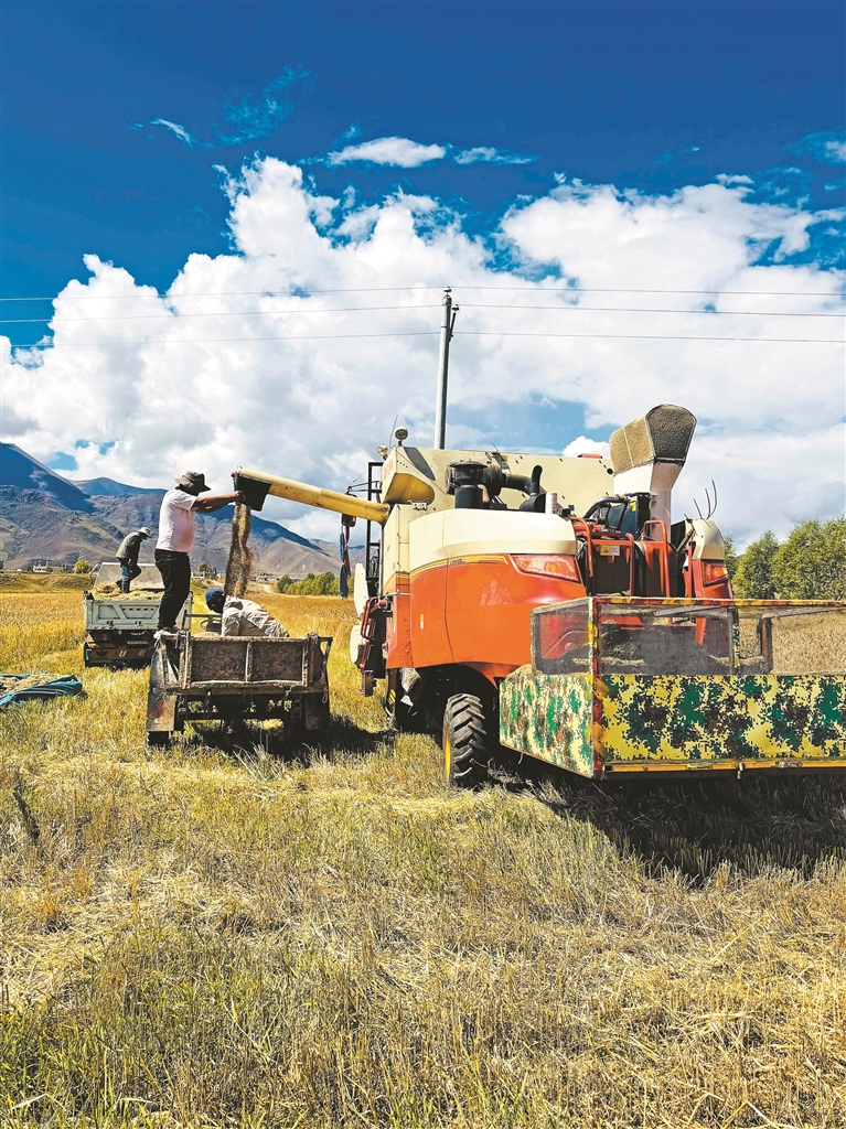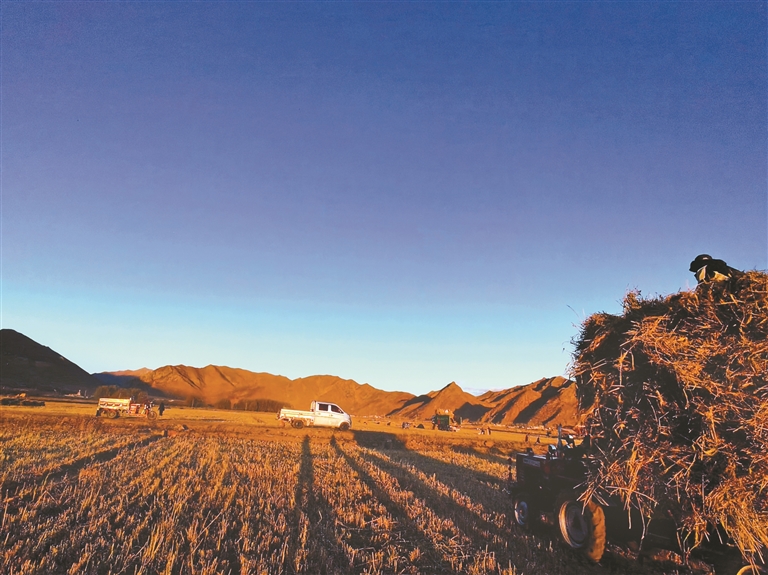 強(qiáng)嘎鎮(zhèn)典沖村村民在田間收割青稞。