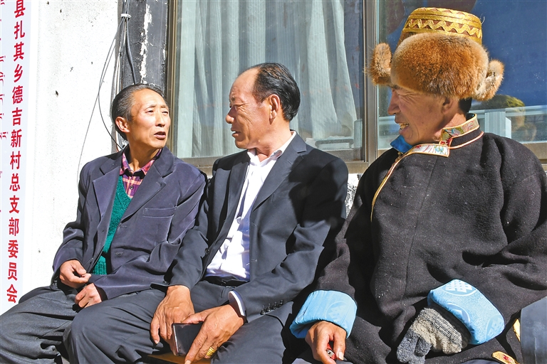 扎囊縣扎其鄉(xiāng)德吉新村,生活著藏族、漢族、土族等不同民族790余名群眾,該村先后榮獲縣級(jí)民族團(tuán)結(jié)進(jìn)步模范集體、山南市民族團(tuán)結(jié)進(jìn)步模范單位、自治區(qū)民族團(tuán)結(jié)進(jìn)步模范村(居)等稱號(hào),是山南市遠(yuǎn)近聞名的“團(tuán)結(jié)村”。 圖為在德吉新村村委會(huì)大院內(nèi),祖籍青海,身著藏裝的村民張積成(右一),與同村不同民族的群眾一起交談。 本報(bào)記者 丹增平措 攝