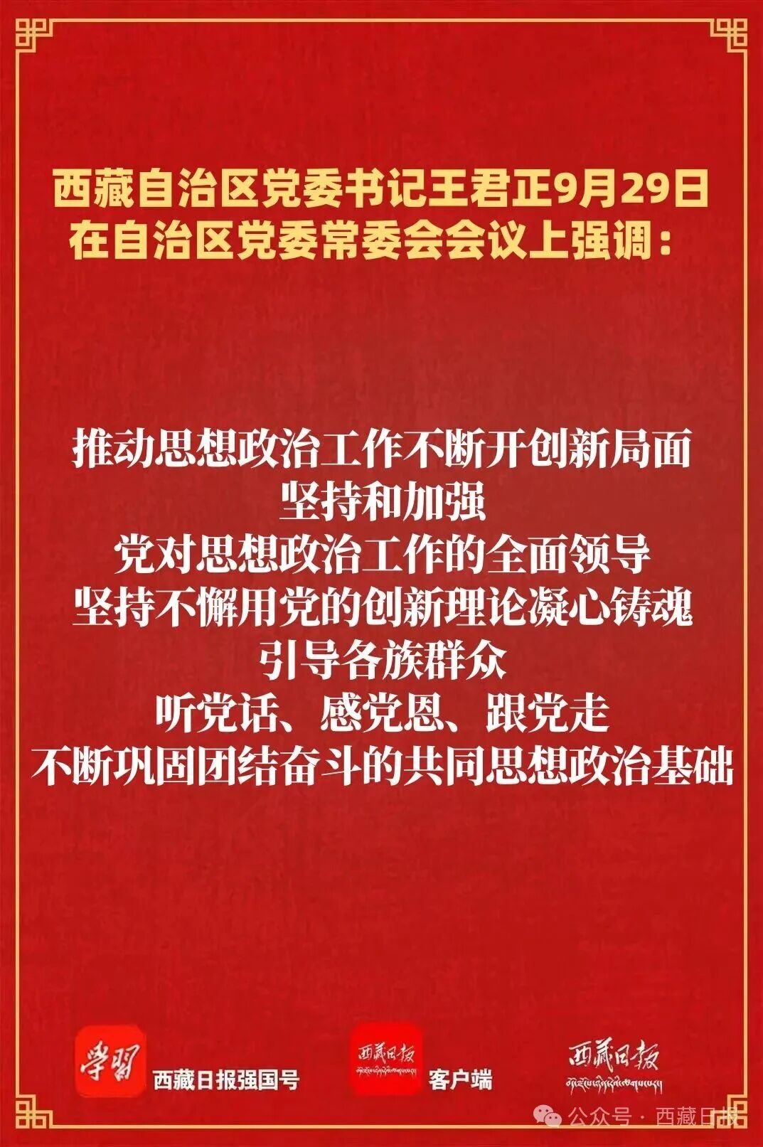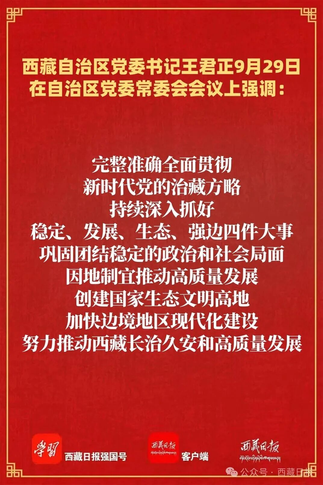 王君正強(qiáng)調(diào),要堅(jiān)持理論聯(lián)系實(shí)際,努力把學(xué)習(xí)成果轉(zhuǎn)化為建設(shè)社會(huì)主義現(xiàn)代化新西藏的強(qiáng)大動(dòng)力。完整準(zhǔn)確全面貫徹新時(shí)代黨的治藏方略,持續(xù)深入抓好穩(wěn)定、發(fā)展、生態(tài)、強(qiáng)邊四件大事,鞏固團(tuán)結(jié)穩(wěn)定的政治和社會(huì)局面,因地制宜推動(dòng)高質(zhì)量發(fā)展,創(chuàng)建國(guó)家生態(tài)文明高地,加快邊境地區(qū)現(xiàn)代化建設(shè),努力推動(dòng)西藏長(zhǎng)治久安和高質(zhì)量發(fā)展。推動(dòng)新時(shí)代黨校(行政學(xué)院)事業(yè)高質(zhì)量發(fā)展,堅(jiān)持黨校姓黨,牢記黨校初心,強(qiáng)化黨的理論教育、黨性教育和履職能力培訓(xùn),不斷提高黨校工作水平,更好為黨育才、為黨獻(xiàn)策。推動(dòng)思想政治工作不斷開(kāi)創(chuàng)新局面,堅(jiān)持和加強(qiáng)黨對(duì)思想政治工作的全面領(lǐng)導(dǎo),堅(jiān)持不懈用黨的創(chuàng)新理論凝心鑄魂,引導(dǎo)各族群眾聽(tīng)黨話、感黨恩、跟黨走,不斷鞏固團(tuán)結(jié)奮斗的共同思想政治基礎(chǔ)。推進(jìn)鄉(xiāng)村全面振興,學(xué)習(xí)運(yùn)用“千萬(wàn)工程”經(jīng)驗(yàn),加快宜居宜業(yè)和美鄉(xiāng)村建設(shè),大力發(fā)展高原特色優(yōu)勢(shì)產(chǎn)業(yè),多措并舉促進(jìn)農(nóng)牧民增收,不斷增強(qiáng)各族群眾的獲得感幸福感安全感。