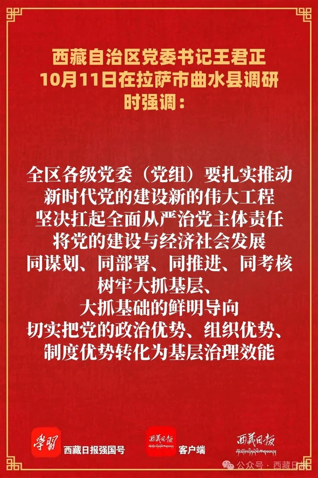 10月11日,自治區(qū)黨委書記王君正前往拉薩市曲水縣,宣講習(xí)近平總書記視察西藏時(shí)的重要講話精神并調(diào)研基層黨建工作。強(qiáng)調(diào),要深入貫徹習(xí)近平總書記關(guān)于黨的建設(shè)的重要思想、關(guān)于西藏工作的重要指示和新時(shí)代黨的治藏方略,認(rèn)真落實(shí)習(xí)近平總書記視察西藏時(shí)的重要講話精神,加強(qiáng)黨的建設(shè),充分發(fā)揮基層黨組織戰(zhàn)斗堡壘作用,不斷打牢黨在西藏的執(zhí)政基礎(chǔ),為社會(huì)主義現(xiàn)代化新西藏建設(shè)提供堅(jiān)強(qiáng)組織保障。