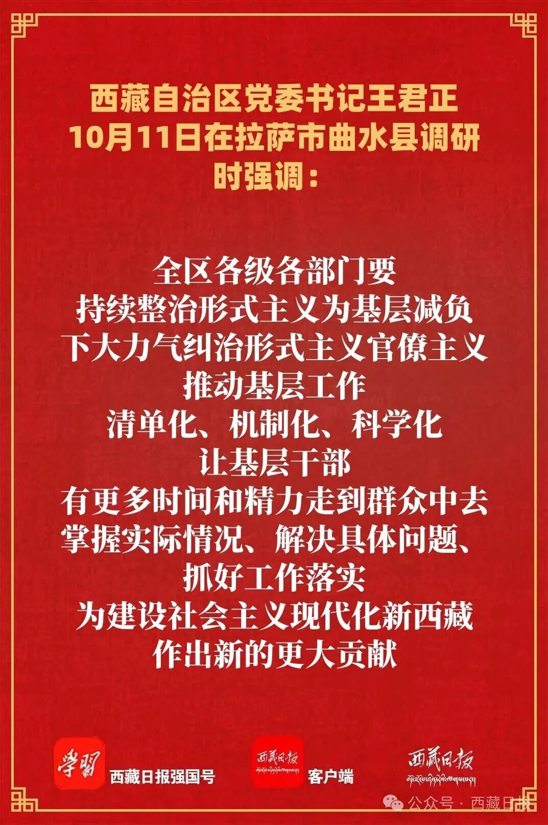王君正強(qiáng)調(diào),全區(qū)各級(jí)各部門要持續(xù)整治形式主義為基層減負(fù),下大力氣糾治形式主義官僚主義,推動(dòng)基層工作清單化、機(jī)制化、科學(xué)化,讓基層干部有更多時(shí)間和精力走到群眾中去,掌握實(shí)際情況、解決具體問題、抓好工作落實(shí),為建設(shè)社會(huì)主義現(xiàn)代化新西藏作出新的更大貢獻(xiàn)。